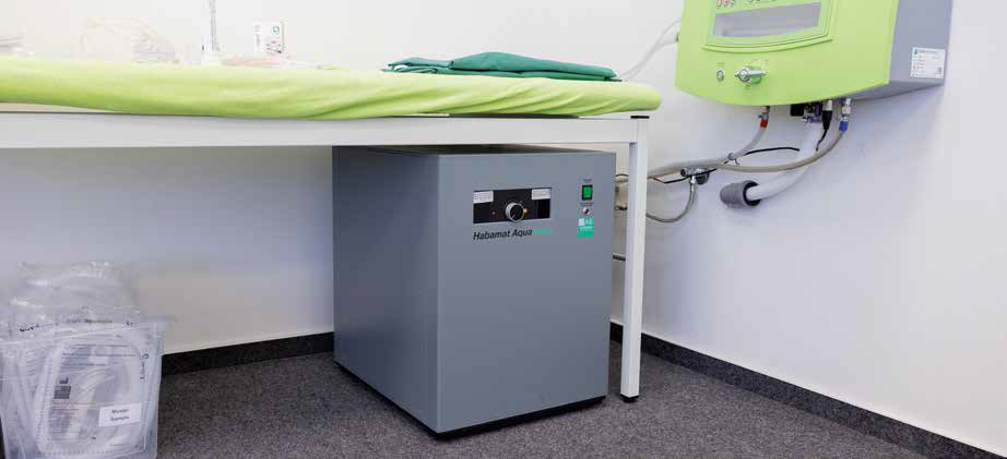 The Habamat Aquaclean is a complementary device according to European standards, which is compatible with all colonic irrigation devices on the market. The upstream connection to the colonic irrigation device prevents bacteria from flowing back into the fresh water line. Vold water is filled into the Habamat Aquaclean, where it is heated and readied for the colonic irrigation device for treatment.